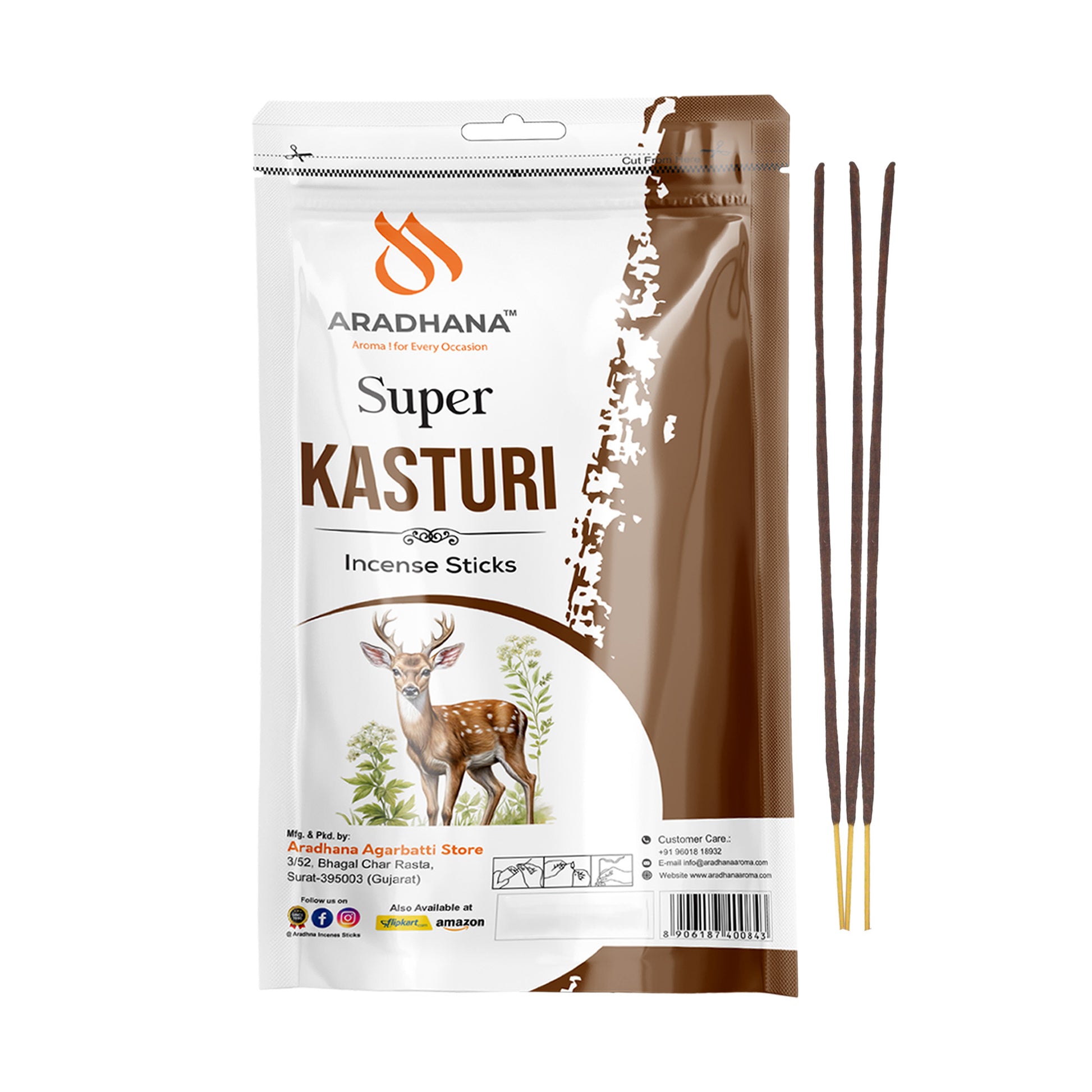 Aradhana Kasturi Zipper is a premium incense stick pack enriched with the deep, musky fragrance of kasturi (musk). Sealed in a high-quality zipper pouch, it maintains its freshness and aroma for longer durations. This pack contains white battis, which ensure smooth and consistent burning, creating a warm and spiritual atmosphere. Perfect for daily pooja, meditation, and relaxation, Aradhana Kasturi Zipper brings the divine essence of kasturi into your space with purity and elegance.
