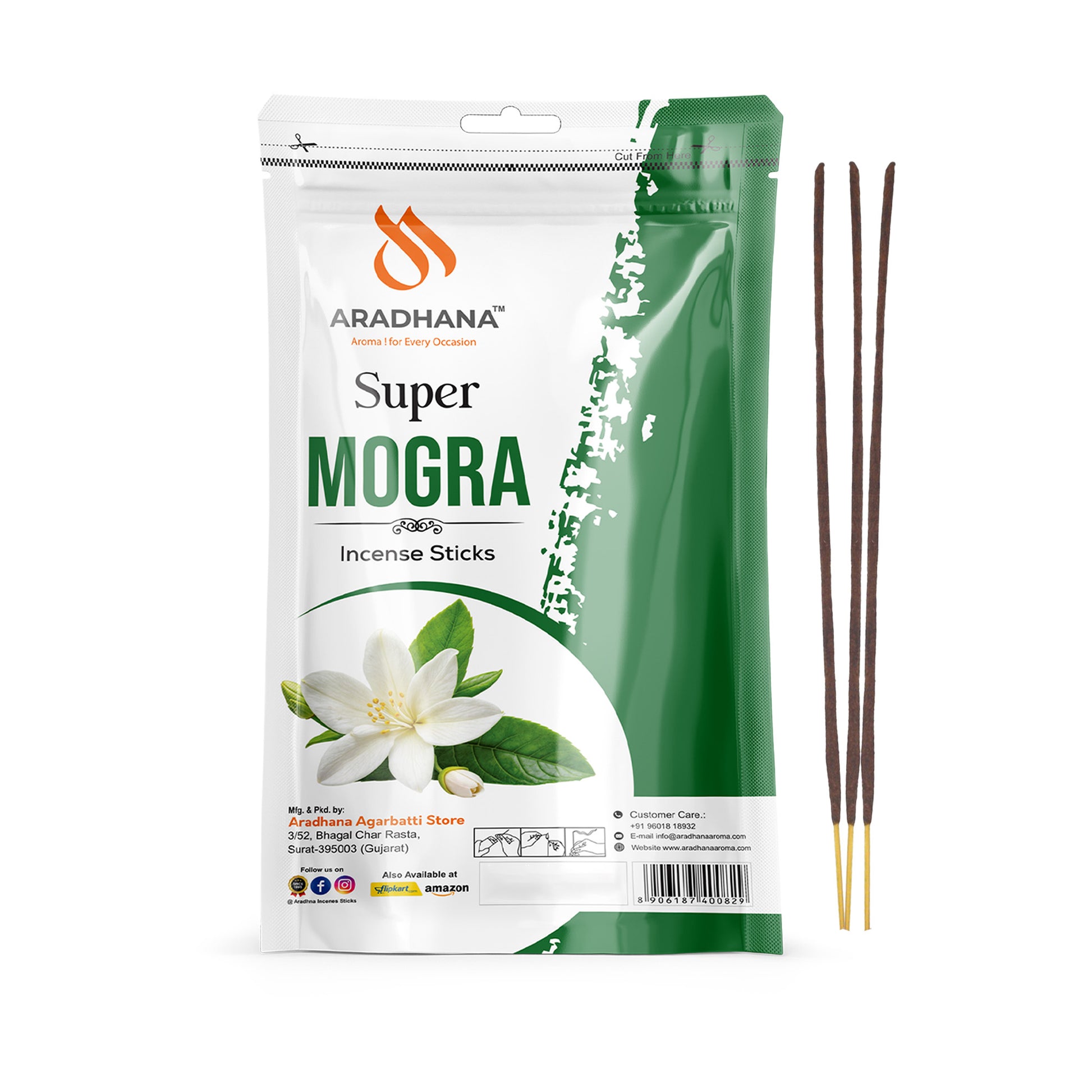 Aradhana Mogra Zipper is a premium-quality incense stick pack infused with the soothing and refreshing fragrance of mogra. Packed in a convenient zipper pouch, it ensures long-lasting freshness and safe storage. This product contains white battis, known for their clean and even burning, offering a calm and spiritual aromatic experience. Ideal for daily prayers, meditation, and creating a peaceful home atmosphere, Aradhana Mogra Zipper brings together purity, tradition, and the natural essence of mogra in every stick.